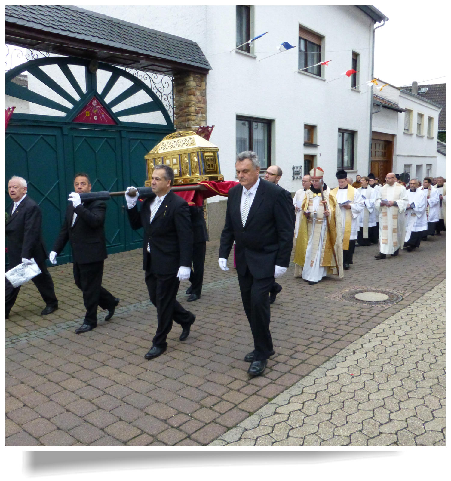 Unsere Aufgabe begann mit der würdevollen Fassung der Reliquien Hildegards in den Reliquienschrein 1929. Seit dem waren mindestens 4 gestandene Männer notwendig, die den schweren Schrein und die Trage zu der jährlich stattfindenden Prozession trugen.
